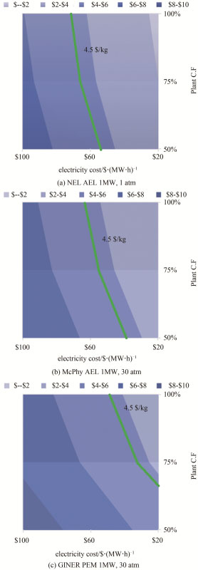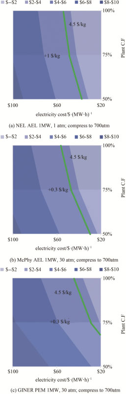 圖5 三個電解系統(tǒng)制氫及壓縮成本作為電力成本和產(chǎn)能因數(shù)的函數(shù)
