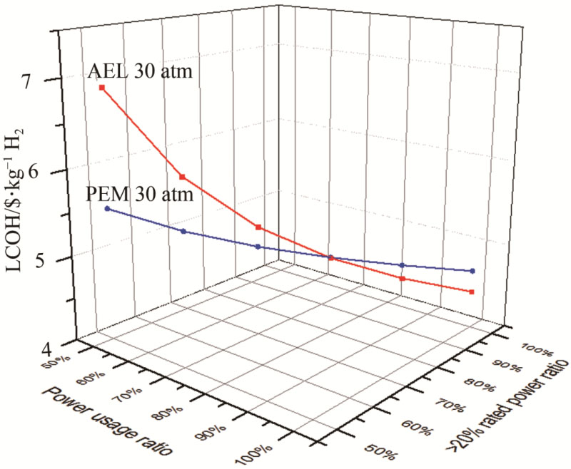 高壓(30 atm) 34.3 MW AEL與26.8 MW PEM電解制氫平準化成本LCOH隨可再生能源波動性的敏感性變化如圖8所示,其中電價以60 $/(MW·h)計算,可再生能源波動性以可再生能源利用率計算,同時考察了可再生能源中大于20%額定功率占比的影響??紤]到對堿性電解裝置小于20%額定功率部分的能量無法啟動裝置,而該部分能量在PEM中可以得到利用,因此在分析可再生能源利用率的同時將功率波動性分為了大于20%額定功率部分與小于20%額定功率波動性兩部分,分析了大于20%額定功率部分占比對LCOH成本的影響??梢钥闯鲈?0 MW可再生能源100%功率供給時,高壓34.3 MW堿性與26.8 MW PEM電解制氫的LCOH相近,PEM電解略高;隨著可再生能源利用率降低,二者的氫氣成本逐漸升高。由于可再生能源中低品質(zhì)部分(小于20%額定功率)的電能在AEL電解中無法利用(堿性可允許的負載區(qū)間為20%~120%),而在PEM電解中該部分能量是可以用于產(chǎn)氫的(PEM可允許的負載區(qū)間為0~150%),隨著可再生能源損失中大于20%額定功率部分的減少(或小于20%額定功率部分的增加),AEL的電解制氫成本較PEM的制氫成本有明顯的升高。當可再生能源利用率為50%時,其中大于20%額定功率部分占比為50%時,PEM的LOCH成本為5.5 $/kg H2,而AEL的LOCH成本達到6.9 $/kg H2。