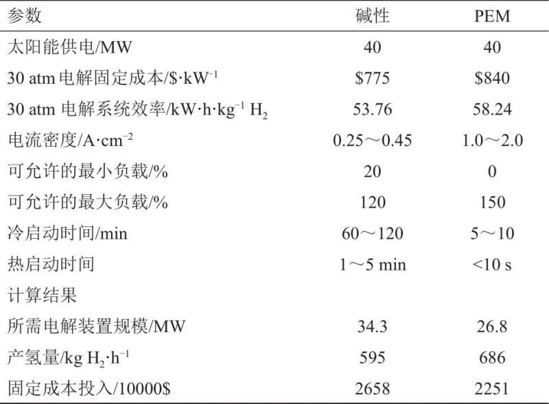 太陽能每天需要冷啟停一次,而且由于陰天下雨等天氣影響,1個自然年太陽能波動供電中低于額定功率20%的電量占比可達20%以上,該部分能量低于堿性電解裝置要求的最小負載,無法使電解裝置啟動,而這部分能量在PEM電解中可以利用起來。PEM電解允許的最大負載為150%,而堿性電解裝置允許的最大負載為120%,40 MW太陽能發(fā)電需要配套34.3 MW堿性電解裝置,如配套PEM電解裝置則僅需26.8 MW,PEM裝置規(guī)??擅黠@小于堿性裝置,固定成本投入方面PEM比堿性更有優(yōu)勢(表3)。由表3可知同樣是40 MW的太陽能輸入26.8 MW的PEM電解裝置每小時可制備氫氣686 kg,或需要配置34.3 MW的堿性電解裝置每小時可制備氫氣595 kg。以上計算沒有考慮占地面積的影響,PEM裝置更加緊湊,同等規(guī)模下PEM占地面積幾乎為堿性裝置的一半,在土地昂貴的地區(qū)PEM電解優(yōu)勢將更加明顯。