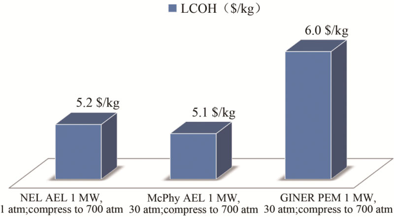 圖6 規(guī)模1MW電解制氫并壓縮至700 atm的平準化成本LCOH比較