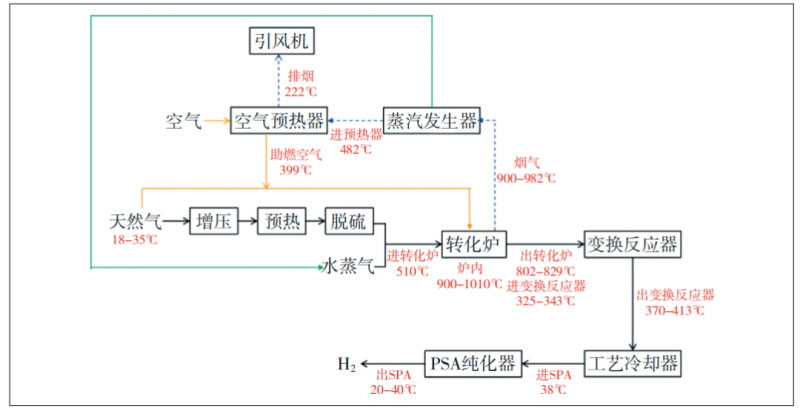 利用化石燃料制氫有部分氧化和氣化兩種技術(shù)路徑,部分氧化是指燃料不完全燃燒而產(chǎn)生合成氣,可用燃料范圍廣,不需要外部熱量輸入,反應速度快,但氫氣產(chǎn)量低。氣化是煤在高溫高壓下部分燃燒生產(chǎn) 合成氣的過程,反應速度快,但固體燃料需要預處理。天然氣重整制氫包括轉(zhuǎn)化反應和變換反應,制得的氫氣純度高,工藝流程如圖2所示。首先對天然氣進行預處理,包括增壓、預熱和脫硫等環(huán)節(jié);然后與蒸汽按一定比例混合,在轉(zhuǎn)化爐中先進入混合氣預熱盤管,預熱到550℃~600℃,再進入轉(zhuǎn)化管,在催化劑層中,進行轉(zhuǎn)化反應CH4+H2O→CO+3H2,ΔH=206.1kJ/mol,反應壓力約2.5MPa,溫度約850℃;余熱回收后,在變換反應器中進行變換反應CO+H2O→CO2+H2,ΔH=-41.2kJ/mol,反應壓力約 2.5MPa,溫度約350℃;變換反應出來的氣體經(jīng)工藝 冷卻器冷卻后進入裝有多種吸附劑的PAS純化器中進 行氫氣提純,CO、CO2等被吸附;最后通過壓縮機加壓、充裝并儲存。轉(zhuǎn)化爐產(chǎn)生的廢氣進入蒸汽發(fā)生 器,生產(chǎn)轉(zhuǎn)化反應用蒸汽;廢氣再從蒸汽發(fā)生器進入空氣預熱器,預熱助燃空氣,用于維持轉(zhuǎn)化爐的燃燒 反應溫度;最后廢氣經(jīng)引風機排至大氣。