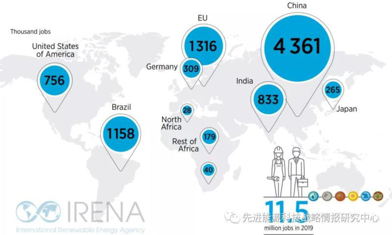 從技術(shù)領(lǐng)域來看,2019年太陽能光伏產(chǎn)業(yè)依然是可再生能源最大的就業(yè)領(lǐng)域,其在制造、安裝、維護及運營等方面共創(chuàng)造了近380萬個就業(yè)崗位,同比增長4%。亞洲是全球最大的光伏市場,從業(yè)人數(shù)達到310萬人,占全球光伏行業(yè)從業(yè)人員總量的83%。北美以6.5%的份額排名其次,而歐洲和非洲分別以4.4%和3.7%排名第三、四位。中國光伏行業(yè)從業(yè)人數(shù)為220萬人,占全球光伏從業(yè)人員總量近三分之二,是全球光伏從業(yè)人員最多的國家;日本(24萬人)和美國(24萬人)從業(yè)人數(shù)均出現(xiàn)下滑情況,但即便如此,兩國依舊是第二、第三大光伏就業(yè)市場。同期歐盟光伏行業(yè)從業(yè)人員數(shù)量顯著增長30%,從2018年的10萬人增長到了2019年的13萬人。生物燃料行業(yè)從業(yè)人員總數(shù)僅次于太陽能光伏,為250萬人,同比增長25%,大部分的工作集中在農(nóng)作物原料供應(yīng)鏈領(lǐng)域(生物質(zhì)原料種植和收集)。拉丁美洲是生物燃料從業(yè)人數(shù)最多的地區(qū),占全球生物燃料行業(yè)從業(yè)總?cè)藬?shù)的近43%,其次是亞洲(34%)、北美(13%)和歐洲(10%)。2018年風(fēng)電行業(yè)從業(yè)人員數(shù)量較去年小幅增長1%至117萬人,與光伏產(chǎn)業(yè)類似,大部分從業(yè)人數(shù)都集中在少數(shù)幾個國家/地區(qū)。僅中國風(fēng)電從業(yè)人員數(shù)量就占到全球風(fēng)能從業(yè)總量的44%,其次是歐洲和北美,分別占27%和11%。水力發(fā)電行業(yè)從業(yè)人員數(shù)量從2018年200萬人降至2019年的190萬人,減少6%,且預(yù)計由于新冠肺炎疫情導(dǎo)致眾多國家的水電站建造停工延遲,2020年水電從業(yè)人數(shù)會進一步下降。中國是全球水電從業(yè)人員數(shù)量最多的國家,占全球的29%,印度以19%緊隨其后,巴西(11%)、巴基斯坦(5%)和越南(4%)分列三到五位。太陽能供暖和制冷行業(yè)從業(yè)人員數(shù)量從2018年的80萬人增至82萬人,主要集中在亞洲市場,該地區(qū)從業(yè)人員數(shù)量占全球同行業(yè)的88%。中國、土耳其、印度、巴西和美國是太陽能供暖和制冷行業(yè)主要的五大就業(yè)市場,五國共計提供了全球93%的就業(yè)崗位。