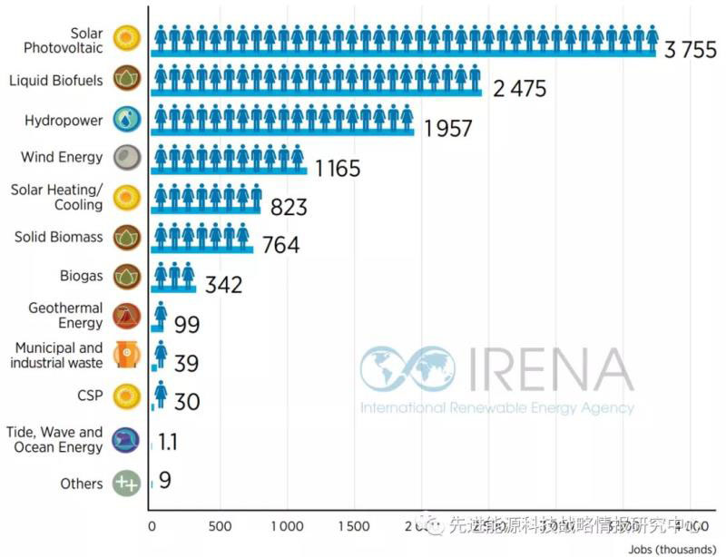圖3 2019年全球可再生能源不同行業(yè)從業(yè)人員情況(單位:千人)