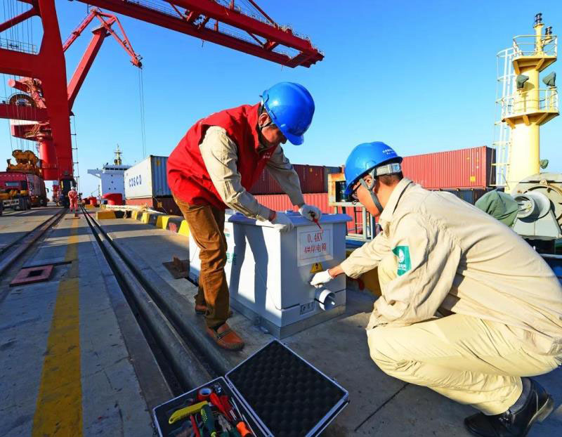 ▲國(guó)網(wǎng)江蘇鹽城供電公司技術(shù)人員在大豐港一期碼頭協(xié)助船舶安裝岸電裝置