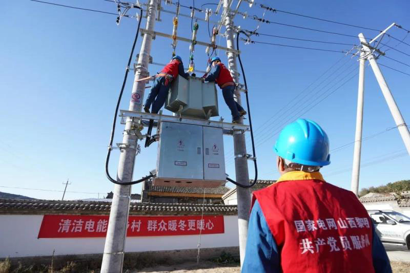 ▲國(guó)網(wǎng)山西電力員工在“煤改電”施工現(xiàn)場(chǎng)安裝變壓器