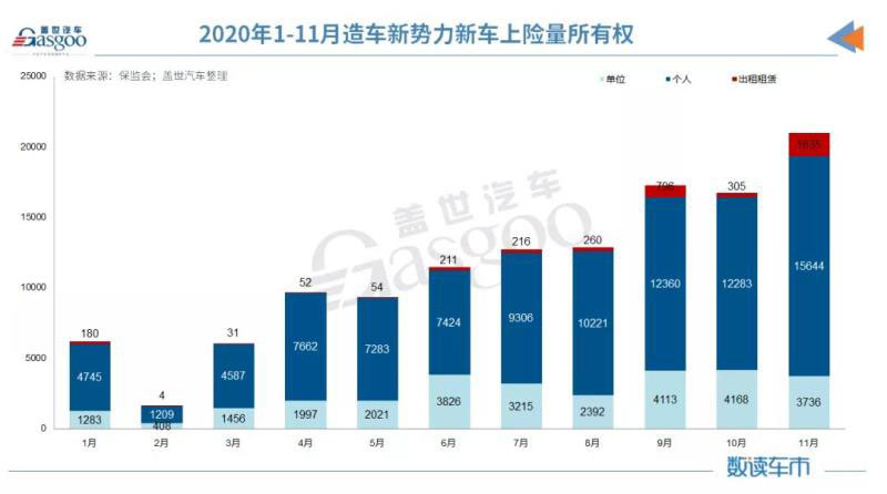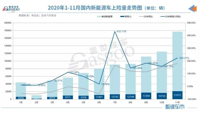 值得一提的是,造車新勢力企業(yè)2020年11月上險量首次突破兩萬輛,達(dá)到21,015輛,較去年同期增長224.21%,增幅高于整體新能源市場。2020年1-11月,造車新勢力累計上險量為12.5萬輛,同比上漲117.77%,占整體新能源市場銷量比重的13.86%。