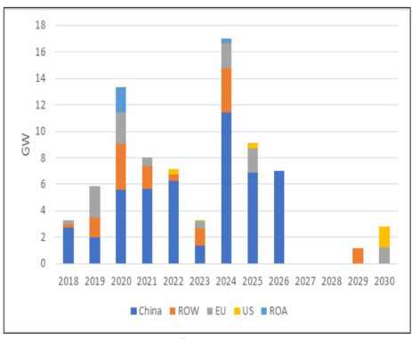 中國(guó)近期計(jì)劃部署的抽水蓄能設(shè)施裝機(jī)容量最高。從2020年至2026年,預(yù)計(jì)中國(guó)將部署35GW以上的抽水蓄能設(shè)施,都是規(guī)模非常大的水電站。例如,中國(guó)計(jì)劃年投資28億美元建設(shè)的豐寧縣水電站的裝機(jī)容量為3.5GW。而在澳大利亞,Genex 電力公司最近與Energy Australia公司簽定了一個(gè)裝機(jī)容量250MW抽水蓄能設(shè)施合同。
