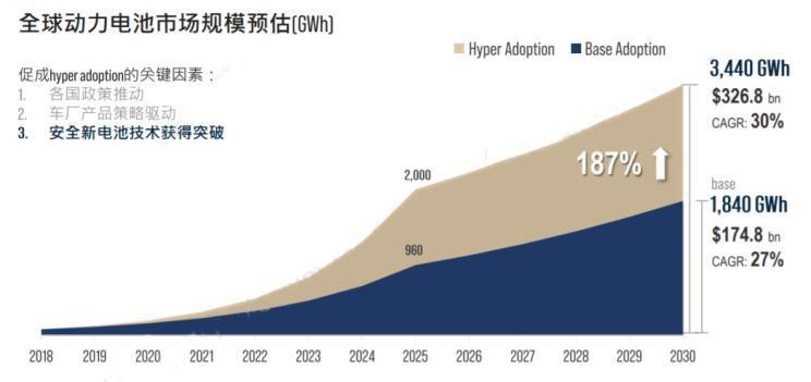 全球來看,有行業(yè)機構(gòu)預(yù)估,如果能克服動力電池安全、續(xù)航方面的問題,到2030年,動力電池產(chǎn)業(yè)規(guī)模可在保守產(chǎn)值1840GWh的基礎(chǔ)上再提升187%。