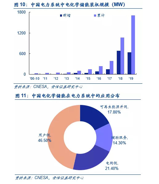 從應用分布來看,用戶側(cè)電化學儲能是主要應用領域,占比約46.5%。截至 2018 年,從中國累計投運的電化學儲能項目的應用分布上看,用戶側(cè)領域的裝機規(guī)模最大,為 470.4MW,占比 46.5%;電網(wǎng)側(cè)和集中式可再生能源并網(wǎng)分列二、三位,分別占比 21.4%和 17.8%。2018年,從中國新增投運的電化學儲能項目的應用分布上看,依然是用戶側(cè)領域的裝機規(guī)模最大,為 293.3MW,占比 42.9%,同比增長 312.5%,電網(wǎng)側(cè)、輔助服務和集中式可再生能源并網(wǎng)分列二至四位。