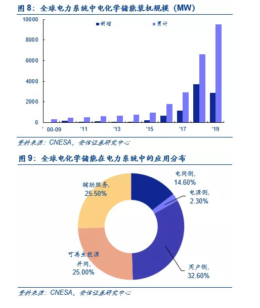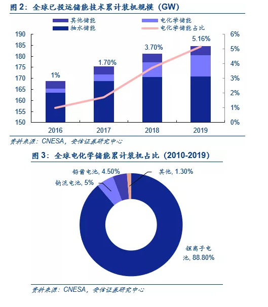電化學儲能中最主要的是鋰離子電池儲能,目前占比約88.75%。到2019年底,全球已投運儲能項目累計裝機規(guī)模184.6GW,其中電化學儲能項目約9.52GW,占比約5.4%。在電化學儲能中,鋰離子電池的累計裝機規(guī)模最大。根據(jù)CNESA統(tǒng)計數(shù)據(jù),2010-2019年累計的9.52GW電化學儲能項目中,鋰離子電池儲能項目為 8.45GW,占比 88.75%。鈉硫電池和鉛蓄電池的應用規(guī)模相對較小,占比分別為 5.4%和 4.5%。