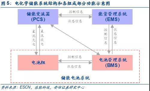 完整的電化學儲能系統(tǒng)主要由電池組、電池管理系統(tǒng)(BMS)、能量管理系統(tǒng)(EMS)、儲能變流器(PCS)以及其他電氣設備構成。其中,電池組是儲能系統(tǒng)最主要的構成部分;電池管理系統(tǒng)(BMS)主要負責電池的監(jiān)測、評估、保護以及均衡等;能量管理系統(tǒng)(EMS)負責數(shù)據(jù)采集、網(wǎng)絡監(jiān)控和能量調(diào)度等;儲能變流器可以控制儲能電池組的充電和放電過程,進行交直流的變換。