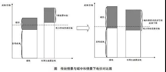 圖為傳統(tǒng)情景與碳中和情景下電力市場(chǎng)交易價(jià)格的對(duì)比。左圖代表在傳統(tǒng)情景下,煤電發(fā)電比例較大??稍偕茉窗l(fā)電價(jià)格高于煤電,即使政府實(shí)施新能源補(bǔ)貼政策,可再生能源發(fā)電價(jià)格也可能較高并處在電力市場(chǎng)均衡交易價(jià)格之上。從價(jià)格角度,傳統(tǒng)化石能源仍然更具競(jìng)爭(zhēng)力。右圖代表在碳中和情景下,可再生能源發(fā)電市場(chǎng)比例高于煤電發(fā)電市場(chǎng)比例,可再生能源占比變大,可再生能源發(fā)電價(jià)格略低于煤電發(fā)電價(jià)格。碳中和目標(biāo)會(huì)推動(dòng)技術(shù)進(jìn)步偏向可再生能源,使得可再生能源的邊際產(chǎn)出增加成本降低,進(jìn)而使得可再生能源發(fā)電價(jià)格低于電力市場(chǎng)的均衡交易價(jià)格,從價(jià)格角度,可再生能源更具競(jìng)爭(zhēng)力。