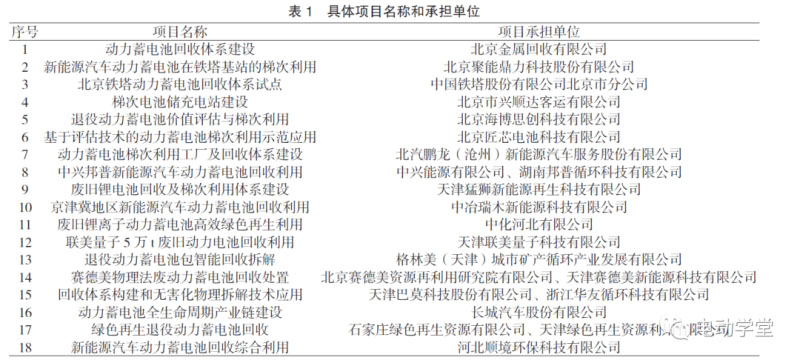 2019年7月,京津冀三地工業(yè)與信息化部門聯(lián)合發(fā)布了《關(guān)于公布京津冀地區(qū)新能源汽車動力電池回收利用試點示范項目名單的通知》,共有18個項目列入試點示范項目名單,具體項目名稱和承擔(dān)單位如表1所示。