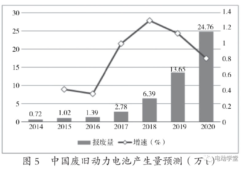 當(dāng)新能源汽車動力電池容量衰減至低于80%時,動力電池就無法滿足電動汽車的動力需求,動力電池就需要進行報廢處置。一般動力電池的使用壽命為5~8年,這意味著動力電池往往先于新能源汽車的報廢。通常,人們根據(jù)新能源汽車銷售量增長幅度和趨勢、動力電池使用壽命來預(yù)測廢鋰離子電池產(chǎn)生量。中國產(chǎn)業(yè)信息網(wǎng)預(yù)測了中國廢舊動力電池回收的產(chǎn)生量,如圖5所示。從圖中可以看出,2019年退役動力電池為13.65萬t,2020年退役量為24.76萬t。