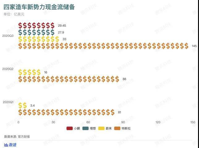 現金流方面,四家公司最新一季的財報顯示,他們都有充沛的現金流和現金等價物,其中中國三家造車新勢力的現金儲備大致相當,體量在30億美元左右,而特斯拉則五倍于這三家公司,依然遙遙領先。