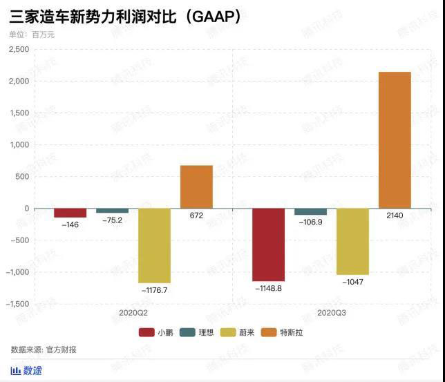 根據四家公司發(fā)的財報和上市招股書數據,特斯拉在2020年第二和第三季度分別獲得了422.7億元和566億元人民幣的收入,這個數字大約是蔚來的12倍,理想的22倍,小鵬的25倍左右。