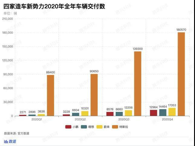 反觀國內三家造車新勢力,2020年的起步是艱難的。疫情導致了代工廠的全面停工,致使小鵬理想和蔚來在2020年第一季度的交付量數據都只有幾千輛,不過隨著我國對于疫情蔓延的控制得當,三家車企在第二季度末開始交付量的狂奔。在2020年最后一個季度,三家車企共交付了超過44000輛的汽車。