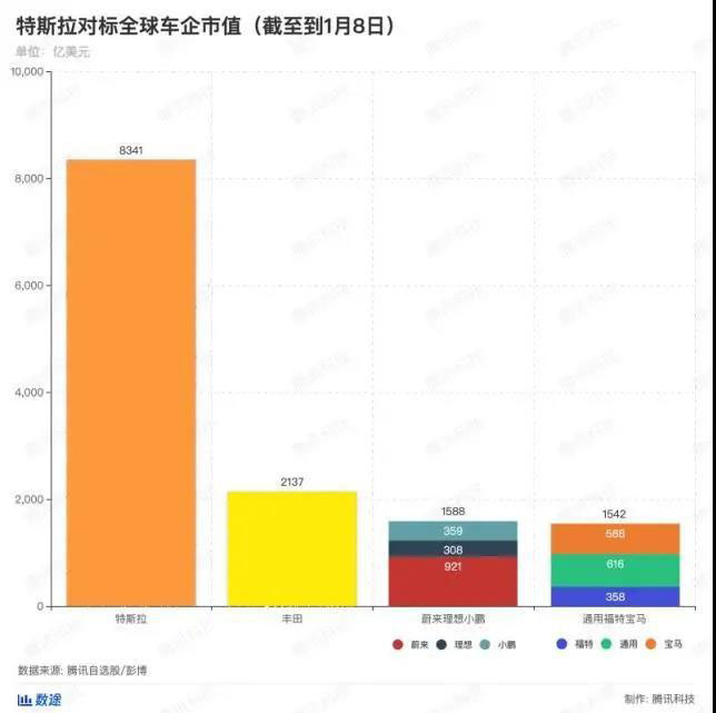 同樣作為電動車新貴的國產造車新勢力,截至1月8日,蔚來理想小鵬三家公司的市值總和也超過「通用+福特+寶馬」的市值總和。傳統(tǒng)汽車行業(yè)在過去的一年并沒有被資本市場所看好,電動車企業(yè)的市值飆升也讓他們的財富得以快速累積。