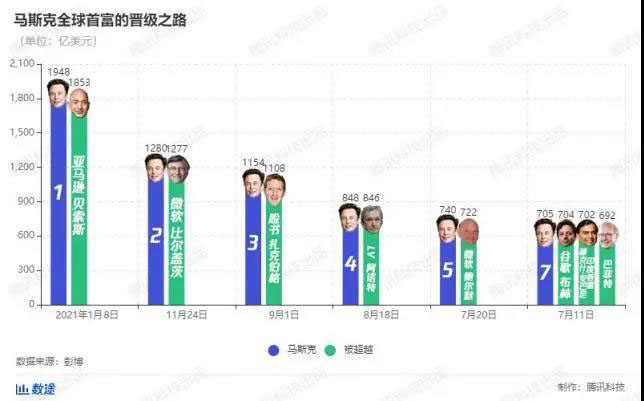 馬斯克也不辱使命一般的,在2021年1月7日晚,順利地超越了亞馬遜的貝索斯,依靠著過去一年特斯拉股價的瘋長,成功坐上了全球首富的位子。更令人感嘆的是,馬斯克成為全球首富的速度,是之前包括比爾·蓋茨、貝索斯、巴菲特在內曾坐過這個位子的大佬們望塵莫及的。