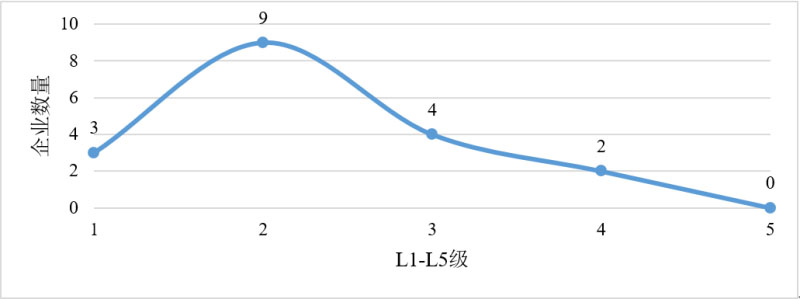 從整體評級來看,18份有效調(diào)研樣本中,L5級企業(yè)0家,L4級企業(yè)2家,L3級企業(yè)4家,L2級企業(yè)9家,L1級企業(yè)3家。由于單項能力評分較低而降級的企業(yè)共3家,其中2家為L3降至L2,1家為L2降至L1,3家都因為應(yīng)用層面分?jǐn)?shù)偏低而降級。