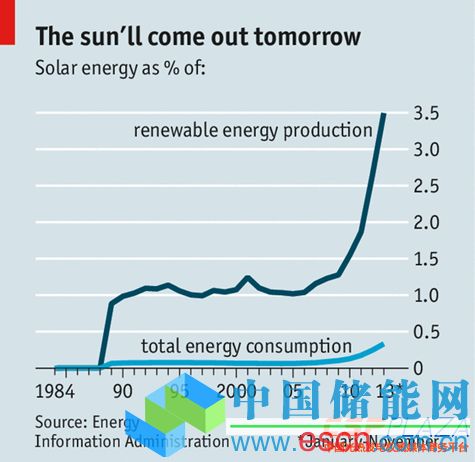盡管基數(shù)低(見下圖),但美國的太陽能一直在快速發(fā)展。去年太陽能發(fā)電占新增發(fā)電能力的29%,僅次于天然氣的46%。自巴拉克·奧巴馬(Barack Obama)上任以來,太陽能發(fā)電量已翻了一番還多;研究公司GTM認(rèn)為,太陽能發(fā)電在2014年將再度增長26%。美國能源部希望,到2050年太陽能可以提供美國27%的電力(目前的比例不到1%)。
