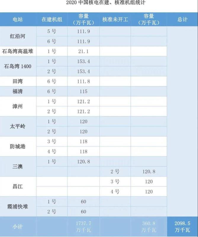 中電聯(lián)的最新數(shù)據(jù)是,截止2020年11月,在總共21.2億千瓦的裝機中,核電裝機占比大約為2.4%。
