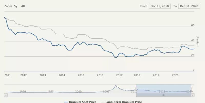 鈾資源方面,中國核電的鈾資源主要通過國內(nèi)開采、海外開發(fā)和海外采購三種途徑共同來滿足。除國內(nèi)的開采能力之外,中廣核、中核在非洲、澳大利亞、中亞多年來投資確保了相當(dāng)數(shù)量的鈾資源。而國際市場上,天然鈾的長協(xié)和現(xiàn)貨價格在2011年之后就一路下滑,最近五年都在20至40美元每磅的低位徘徊,在國際市場上買鈾既不難也不貴。