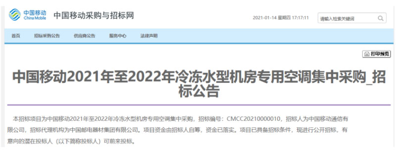 中國儲(chǔ)能網(wǎng)訊:日前,中國移動(dòng)發(fā)布2021年至2022年冷凍水型機(jī)房專用空調(diào)集中采購招標(biāo)公告,規(guī)模為3666臺(tái),相較2018-2019年集采規(guī)模上漲超過50%。