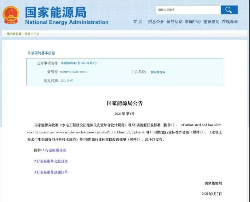 中國儲(chǔ)能網(wǎng)訊:2020年1月7日,國家能源局批準(zhǔn)《水電工程建設(shè)征地移民安置綜合設(shè)計(jì)規(guī)范》等320項(xiàng)能源行業(yè)標(biāo)準(zhǔn)、《Carbon steel and low alloy steel for pressurized water reactor nuclear power plants-Part 7: Class 1, 2, 3 plates》等113項(xiàng)能源行業(yè)標(biāo)準(zhǔn)外文版、《水電工程水生生態(tài)調(diào)查與評價(jià)技術(shù)規(guī)范》等5項(xiàng)能源行業(yè)標(biāo)準(zhǔn)修改通知單(附件3)。