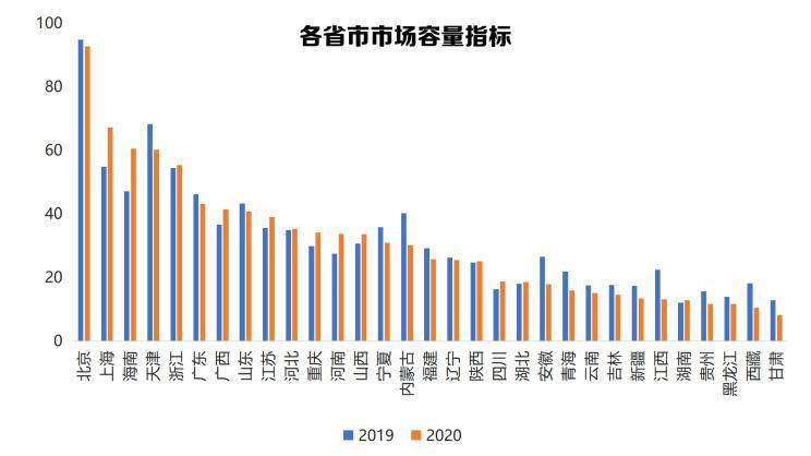 從市場(chǎng)容量指標(biāo)來看,疫情導(dǎo)致部分省份新能源汽車銷量和滲透率有所降低,但仍有13個(gè)省市的市場(chǎng)容量指標(biāo)指數(shù)超過2019年。其中,北京、上海地區(qū)市場(chǎng)容量最高,甘肅、西藏地區(qū)新能源汽車市場(chǎng)環(huán)境較為落后。