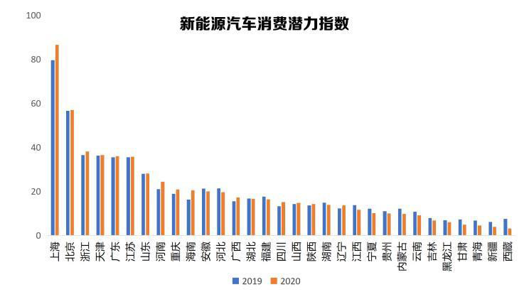其中,2020年上海消費(fèi)潛力指數(shù)最高;長三角、北京、廣東、天津的消費(fèi)潛力較大;西北、東北地區(qū)由于車輛應(yīng)用環(huán)境惡劣和配套資源較少原因,新能源汽車潛力指數(shù)較低,市場(chǎng)仍待進(jìn)一步拉動(dòng)和扶植。