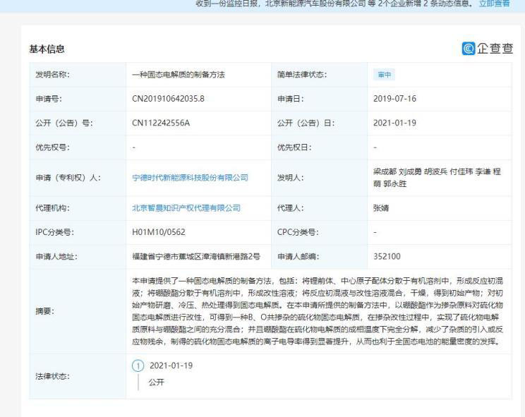 其中第一條公開號為CN112242556A,專利摘要顯示,本申請?zhí)峁┝艘环N固態(tài)電解質(zhì)的制備方法,包括:將鋰前體、中心原子配體分散于有機(jī)溶劑中,形成反應(yīng)初混液;將硼酸酯分散于有機(jī)溶劑中,形成改性溶液;將反應(yīng)初混液與改性溶液混合,干燥,得到初始產(chǎn)物;對初始產(chǎn)物研磨、冷壓、熱處理得到固態(tài)電解質(zhì)。在本申請所提供的制備方法中,制得的硫化物固態(tài)電解質(zhì)的離子電導(dǎo)率得到顯著提升,從而也利于全固態(tài)電池的能量密度的發(fā)揮。