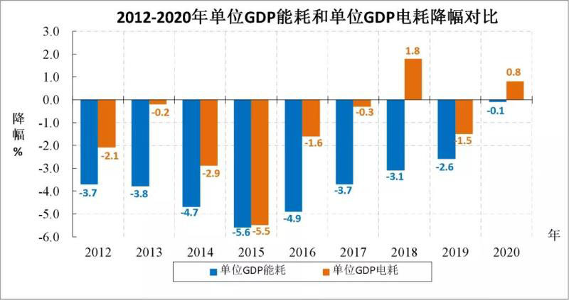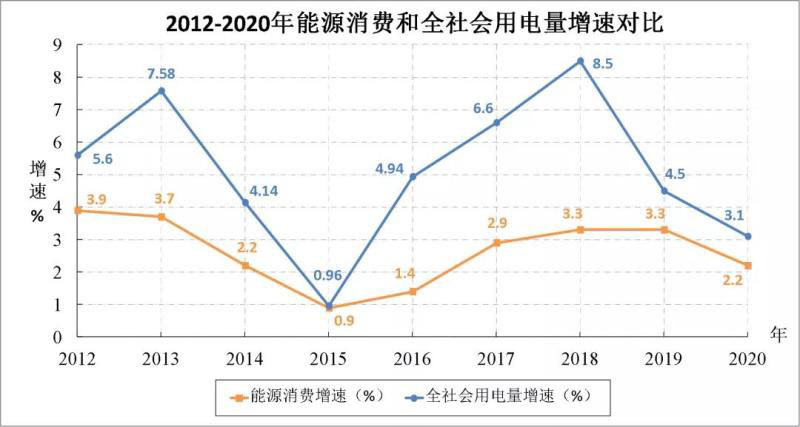 根據(jù)國家統(tǒng)計(jì)局和國家發(fā)改委近期發(fā)布的數(shù)據(jù),2020年我國國內(nèi)生產(chǎn)總值比上年增長2.3%,能源消費(fèi)總量同比增長2.2%,全社會用電量同比增長3.1%。由此計(jì)算可知我國單位產(chǎn)值能耗下降0.1%,單位產(chǎn)值電耗增長0.8%。能源消費(fèi)彈性系數(shù)為0.96,電力消費(fèi)彈性系數(shù)為1.35。在單位產(chǎn)值能耗下降的同時電耗增長明顯,表明我國終端能源消費(fèi)構(gòu)成中的電力比重明顯提高,我國電氣化水平持續(xù)提升。