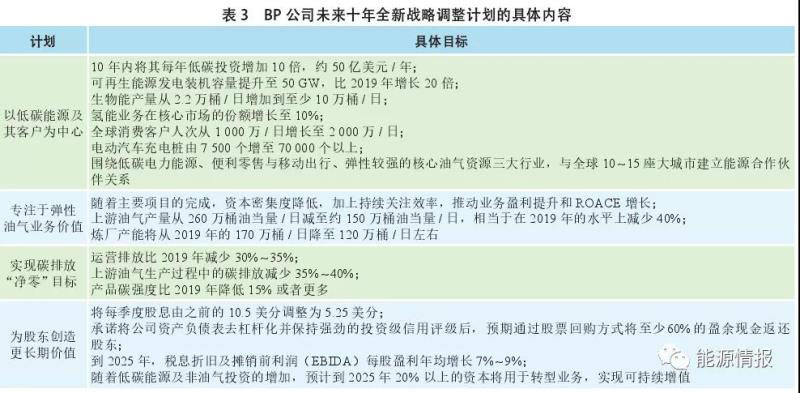 2020年8月4日,BP公司發(fā)布全新戰(zhàn)略計(jì)劃,宣布從傳統(tǒng)的“國(guó)際石油公司”轉(zhuǎn)型為“綜合能源公司”,重新配置重點(diǎn)業(yè)務(wù),并公布了未來十年詳細(xì)的調(diào)整計(jì)劃(見表3)。同時(shí),BP還宣布了近十年來首次的股息削減,以為新戰(zhàn)略推進(jìn)提供資金保障。