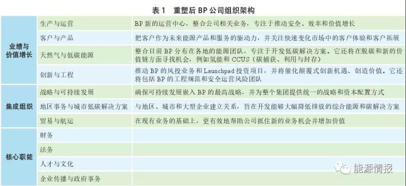 2020年初,BP公司宣布組織重構(gòu)方案,變革傳統(tǒng)業(yè)務(wù)劃分模式,打破專業(yè)、資源、技術(shù)等的分割,優(yōu)化組織架構(gòu),從而促進(jìn)產(chǎn)業(yè)鏈一體化協(xié)同創(chuàng)新作用的發(fā)揮。變革后的組織架構(gòu)中重新設(shè)立了全新四大業(yè)務(wù)板塊、三大集成部門和四大職能部門(見表1)。四大業(yè)務(wù)板塊包括生產(chǎn)與運(yùn)營(yíng)、客戶與產(chǎn)品、天然氣與低碳能源、創(chuàng)新與工程,將新能源提升為與油氣生產(chǎn)運(yùn)營(yíng)并重的獨(dú)立板塊。而三大集成部門包括戰(zhàn)略與可持續(xù)發(fā)展、地區(qū)事務(wù)與城市低碳、貿(mào)易與航運(yùn),主要目標(biāo)是發(fā)現(xiàn)新機(jī)遇并將其價(jià)值最大化。從更加敏捷和高效支持業(yè)務(wù)運(yùn)營(yíng)出發(fā),設(shè)立了財(cái)務(wù)、法務(wù)、人才與文化和企業(yè)傳播與政府事務(wù)等四大核心部門。
