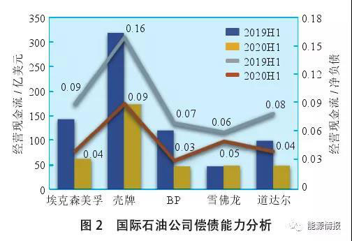近年來,BP公司資產(chǎn)負(fù)債率逐年上升,負(fù)債承壓較重,截至2020年二季度,資產(chǎn)負(fù)債率達(dá)68.5%,遠(yuǎn)高于其他國(guó)際石油公司同期水平。同時(shí),BP的經(jīng)營(yíng)凈現(xiàn)金流匱乏愈發(fā)嚴(yán)重,上半年僅為46.9億美元,同比下降61.3%,遠(yuǎn)低于同為“三超”公司的??松梨诤蜌づ疲ń?jīng)營(yíng)凈現(xiàn)金流分別為62.8億美元和174.2億美元)。相對(duì)應(yīng)地,BP公司短期償債能力急劇下降,2020年上半年經(jīng)營(yíng)凈現(xiàn)金流/長(zhǎng)短期借款比例僅為0.03,處于五大國(guó)際石油公司末位(見圖2)。