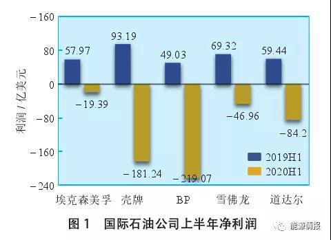 2020年上半年BP公司營(yíng)業(yè)收入同比大幅下降34.3%,凈利潤(rùn)虧損達(dá)到219.1億美元,虧損額和虧損幅度在五大國(guó)際石油公司中均居首位(見圖1),僅其第二季度歸屬母公司凈利潤(rùn)就已虧損168.5億美元。