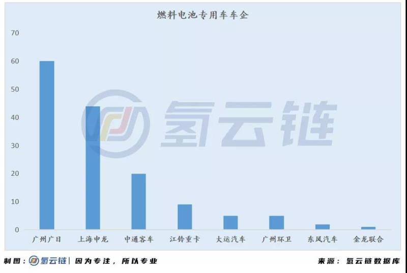 從各燃料電池車企分布來看,共有8家車企的燃料電池專用車在各地上險(xiǎn)。其中,廣州廣日、上海申龍和中通客車都有超過20輛車上險(xiǎn),其中廣州廣日有60輛燃料電池專用車上險(xiǎn),占整個(gè)專用車上險(xiǎn)量為41.1%,排名第一;上海申龍有40輛專用車上險(xiǎn),排名第二;中通客車20輛,排名第三;江鈴重卡有9輛車上險(xiǎn),排名第四;大運(yùn)汽車、廣州環(huán)衛(wèi)均有5輛車上險(xiǎn),并列第五;東風(fēng)汽車、金龍聯(lián)合分別有2輛和1輛上險(xiǎn),排名緊隨其后。