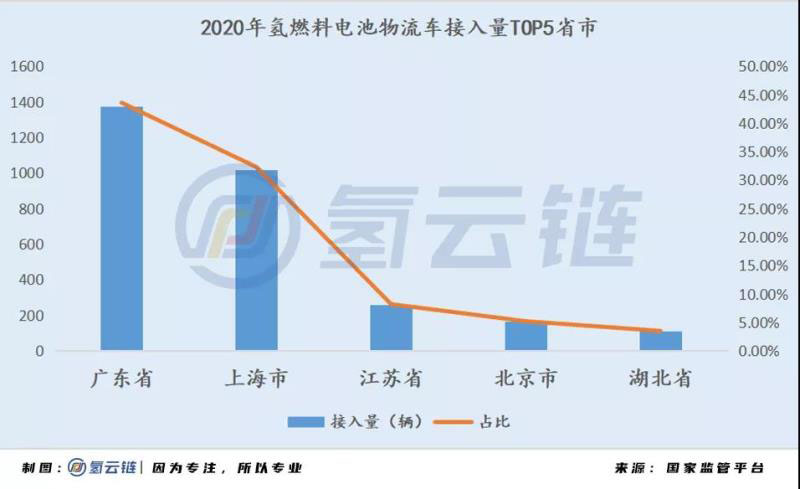 在地域分布上,廣東省和上海市氫燃料電池物流車推廣效果突出,截至2020年底,廣東省和上海市氫燃料電池物流車示范推廣數(shù)量分別為1376輛和1018輛,分別占全國氫燃料電池物流車接入量的43.6%、32.3%。江蘇省、北京市、湖北省分別以260輛、165輛和110輛,排名第三至第五位;值得注意的是,排行前5位的省市累計(jì)接入氫燃料電池物流車2929輛,占全國氫燃料電池物流接入量的比例為92.9%。