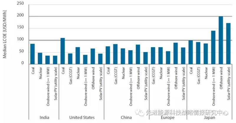 由于有利于可再生能源發(fā)電的地址條件不同、燃料成本差異以及技術成熟度有別,所有發(fā)電技術的成本都因各國和地區(qū)而大相徑庭。此外,一項發(fā)電技術在電力系統(tǒng)發(fā)電總量中的占比對其價值、負荷因子和平均成本也有影響。雖然在本報告中大多數(shù)國家的可再生能源發(fā)電技術都有很強競爭力,但數(shù)據(jù)顯示,在一些國家(如日本、韓國和俄羅斯)的可再生能源成本仍高于化石燃料發(fā)電或核能發(fā)電。即使在同一國家,不同區(qū)域的條件不同也會造成地方一級的發(fā)電成本差異。在歐洲,陸上風電和海上風電以及公用事業(yè)規(guī)模太陽能發(fā)電都能夠與天然氣和新建核電相競爭。在美國,燃氣發(fā)電受益于預期較低的天然氣價格,但從電廠LCOE中位數(shù)來看,陸上風電和公用事業(yè)規(guī)模光伏是成本最低的發(fā)電技術(碳價30美元/噸CO2),比燃氣發(fā)電成本更高的是海上風電、新建核電和燃煤發(fā)電。在中國和印度,預期間歇性可再生能源LCOE將達到最低,公用事業(yè)規(guī)模太陽能光伏和陸上風電是成本最低的發(fā)電技術,核電也具有一定的競爭力,為兩國目前碳密集型發(fā)電結構的轉型提供了有前景的技術選擇方案。