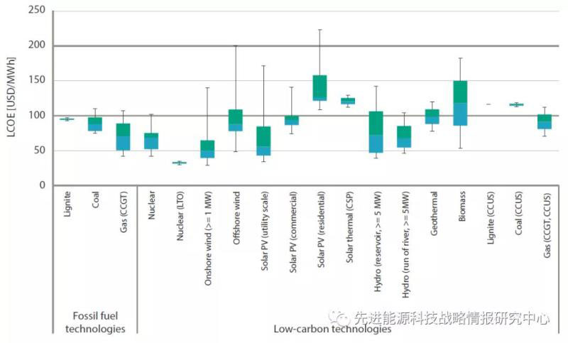 圖1 不同技術平準化發(fā)電成本區(qū)間(單位:美元/兆瓦時)