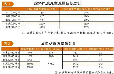 氫能可實(shí)現(xiàn)跨部門、跨時(shí)間和跨地點(diǎn)的靈活轉(zhuǎn)移能源,減少棄風(fēng)、棄光、棄水,在向可再生能源轉(zhuǎn)型中發(fā)揮系統(tǒng)性作用。日本、韓國、歐盟的氫能路線圖均對(duì)氫能在移動(dòng)端和固定端的應(yīng)用、加氫站建設(shè)和氫氣供應(yīng)作了規(guī)劃。氫燃料電池汽車(FCV)是氫能應(yīng)用領(lǐng)域最為重要的一環(huán)。但各國(組織)燃料電池汽車的總量目標(biāo),車型選擇,配套加氫站建設(shè),以及氫氣供應(yīng)策略和固定端氫能應(yīng)用重點(diǎn)方向各不相同。