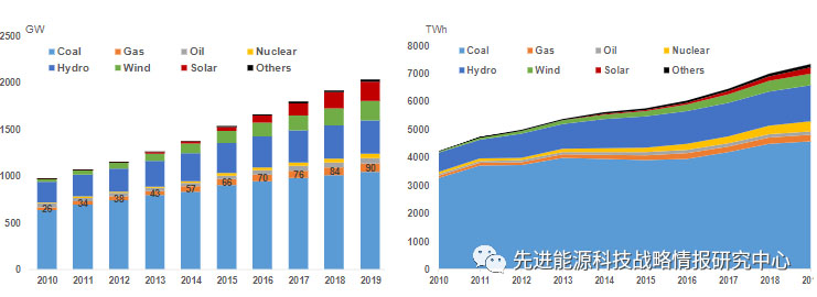 圖1 2010-2019年中國電力裝機(jī)容量(左圖,單位:吉瓦)和發(fā)電量(右圖,單位:太瓦時(shí))