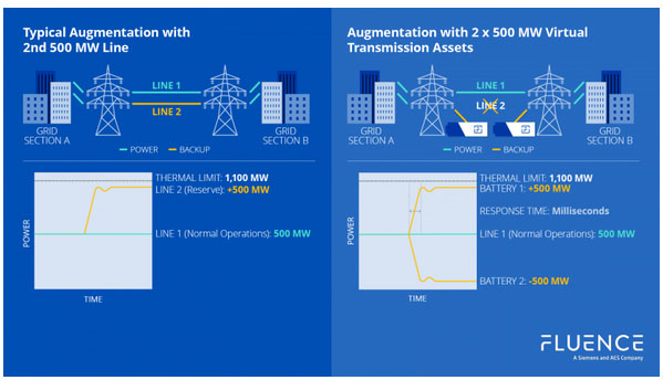 虛擬輸電是指采用專門部署的電池儲(chǔ)能系統(tǒng)系統(tǒng)代替輸電線路,以提供容量、服務(wù)和功能的組合,從而實(shí)現(xiàn)比傳統(tǒng)電力解決方案更大的價(jià)值。虛擬輸電項(xiàng)目可以采取單一資產(chǎn)串聯(lián)部署的能源資產(chǎn)組合(作為“虛擬輸電線路”)的形式來模擬電網(wǎng)的電力線路,或者作為電力系統(tǒng)的資產(chǎn)組合。關(guān)鍵是電網(wǎng)需要這樣的電池儲(chǔ)能系統(tǒng)來提供: