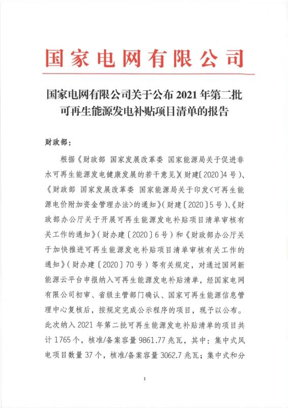 關(guān)于公布2021年第二批可再生能源發(fā)電補(bǔ)貼項(xiàng)目清單的公告