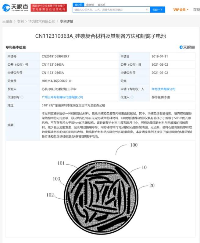 我們從天眼查App上查詢到,在近日,華為技術(shù)有限公司公開“硅碳復(fù)合材料及其制備方法和鋰離子電池”發(fā)明專利,公開號為CN112310363A。