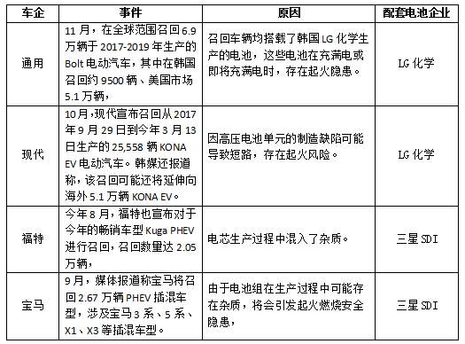 2020年,包括通用、現(xiàn)代、福特、寶馬等多家國際車企的主力電動車型都因動力電池安全問題接連出現(xiàn)召回。這不僅將背后的韓系電池企業(yè)陷入輿論漩渦,同時,也在世界范圍內(nèi)將電動汽車安全問題推到了風(fēng)口浪尖。