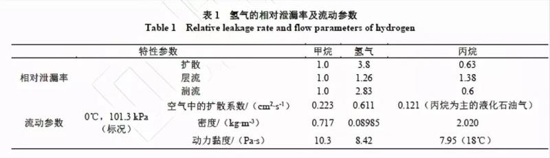 早在90年代,就有科學(xué)家研究了氫氣的泄漏特性,表1列出了氫氣的相對泄漏率及流動參數(shù)。氫氣比其他燃料或氣體泄漏速率更快:在層流狀態(tài)下,氫氣的泄漏速率約為甲烷的1.26倍,而在高壓下,氫氣往往處于湍流狀態(tài),此時它的泄漏速率更快,約為甲烷的2.83倍。另外,氫氣極易擴散,其在薄膜中的擴散速度約為甲烷的3.8倍。在非受限空間內(nèi),一旦發(fā)生意外泄漏,由于氫氣密度比空氣低,會迅速上浮并向四周擴散。而在受限空間,泄漏的氫氣易于在局部聚積,由于其高擴散性,能夠快速形成危險的可燃性混合物。