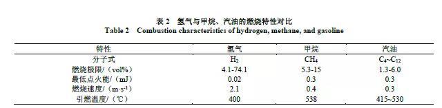氫氣的燃燒速度很快,暴秀超等人發(fā)現(xiàn)在常溫常壓(27℃,0.1MPa)下,當(dāng)燃空比為1時,氫氣的燃燒速度可達2m·s-1左右,而天然氣的燃燒速度僅為0.4m·s-1,所以氫氣常常被作為燃料的添加劑用來提升體系的層流燃燒速度。在空氣中,氫氣的燃燒范圍很寬,一般為4.1%-74.1%。另外,氫氣點火能極低,它的最小點火能量大約為0.02mJ,約為汽油的十分之一。表2列出了氫氣及一些常用燃料的燃燒特性參數(shù)。