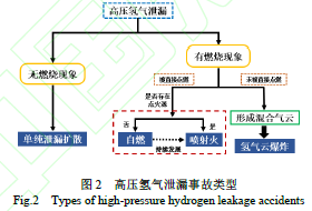然而,安全性一直是氫能全生命周期運行的突出瓶頸問題。由以上可知,高壓又是其中最為突出的風(fēng)險要素。無論是高壓制氫、高壓儲氫還是高壓運氫環(huán)節(jié),如遇到高溫、氫脆破壞或外部撞擊等,極易引發(fā)高壓氫氣的泄漏和擴散,甚至更為嚴(yán)重的火災(zāi)和爆炸事故災(zāi)害。根據(jù)高壓氫氣的泄漏行為,可將事故總體分為無燃燒泄漏擴散和有燃燒泄漏兩種,如圖2所示。無燃燒泄漏擴散,即高壓氫氣只發(fā)生單純的泄漏擴散,未遇點火源或發(fā)生自燃。有燃燒泄漏則可分為三種情形:一是當(dāng)氫氣泄漏形成射流后,遇到點火源引發(fā)噴射火;二是雖無外部點火源,但高壓氫氣發(fā)生了自燃,并且可能發(fā)展為噴射火;三是氫氣泄漏后先是在一定空間內(nèi)與空氣混合形成氣云,此時若遇到點火源,則極易發(fā)生氫氣云爆炸。僅2019年,挪威、美國就相繼發(fā)生多起氫氣爆炸,事故起因分別是氫氣云爆炸和氫氣自燃引發(fā)的連鎖爆炸,這些再一次引發(fā)公眾對氫能安全的廣泛關(guān)注、擔(dān)憂甚至恐慌。亟需對高壓氫氣的安全問題開展系統(tǒng)地研究和闡述,充分掌握事故演化規(guī)律,為氫能安全防控技術(shù)開發(fā)及安全標(biāo)準(zhǔn)制定提供科學(xué)依據(jù)和有力工具。